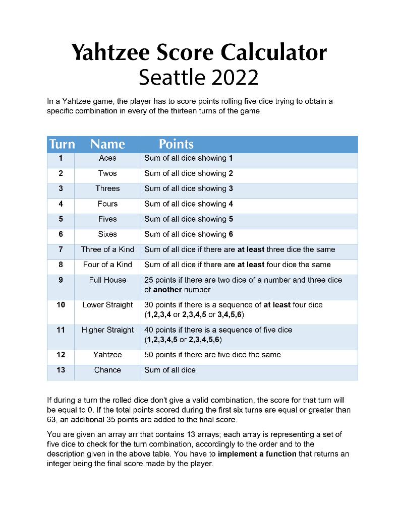The count array shown is the array of dice values. You get 50 points for the first Yahtzee in the game and 100 points for each additional Yahtzee. A player will keep a Yahtzee or Full House.